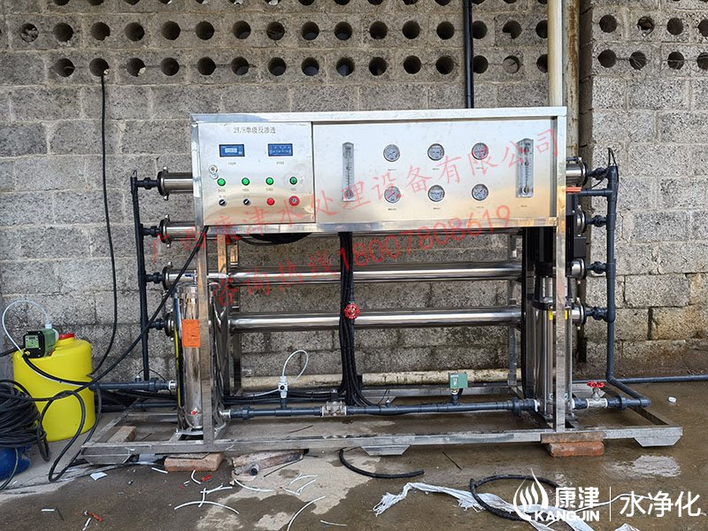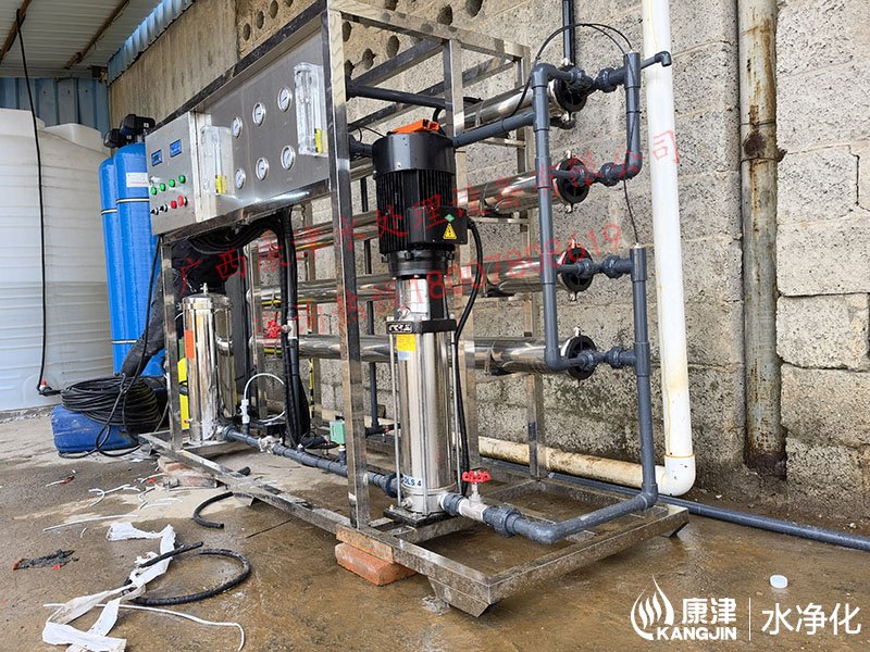 工藝流程:井水-原水箱-石英砂過濾器-活性炭過濾器-精密過濾器-增壓泵-反滲透設備-凈水箱